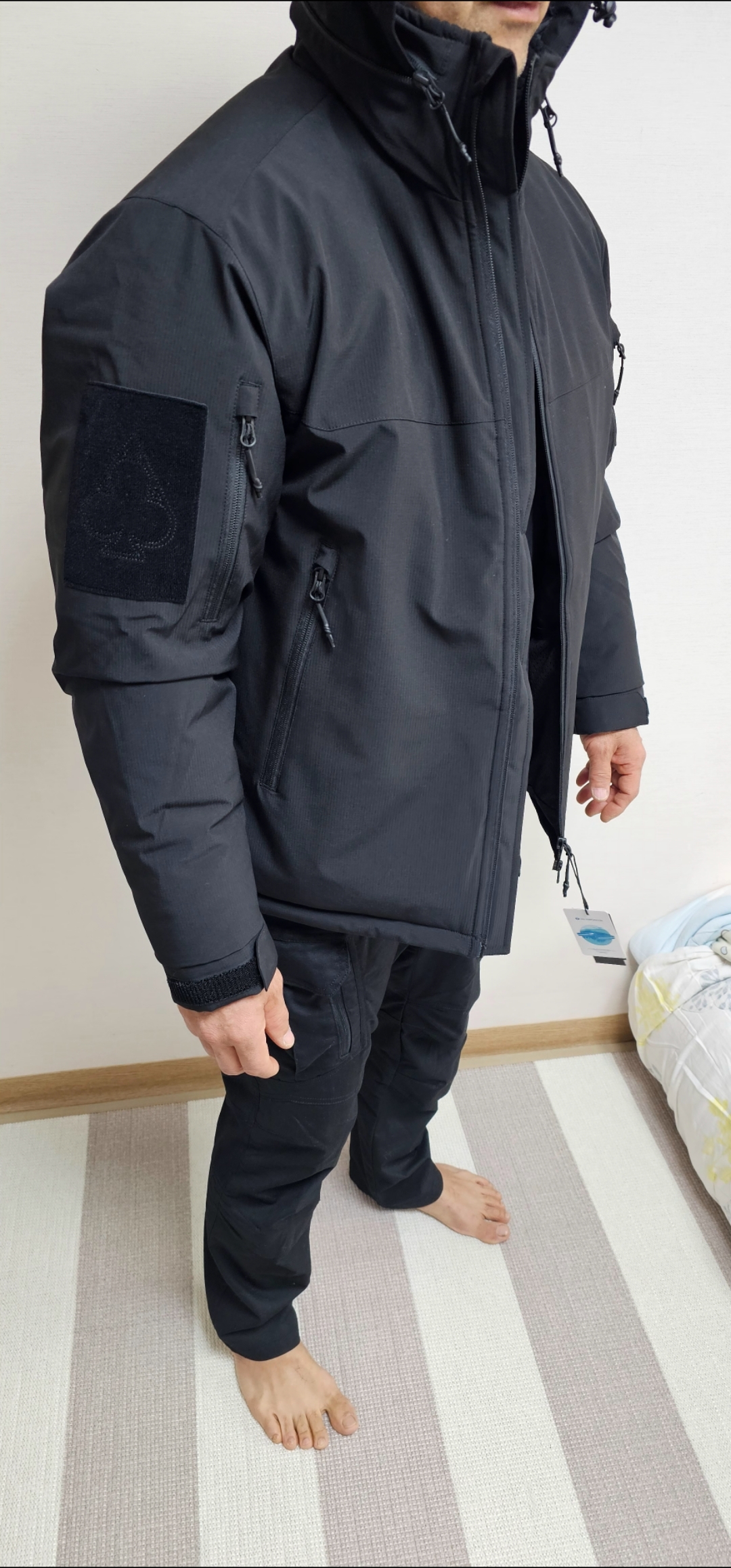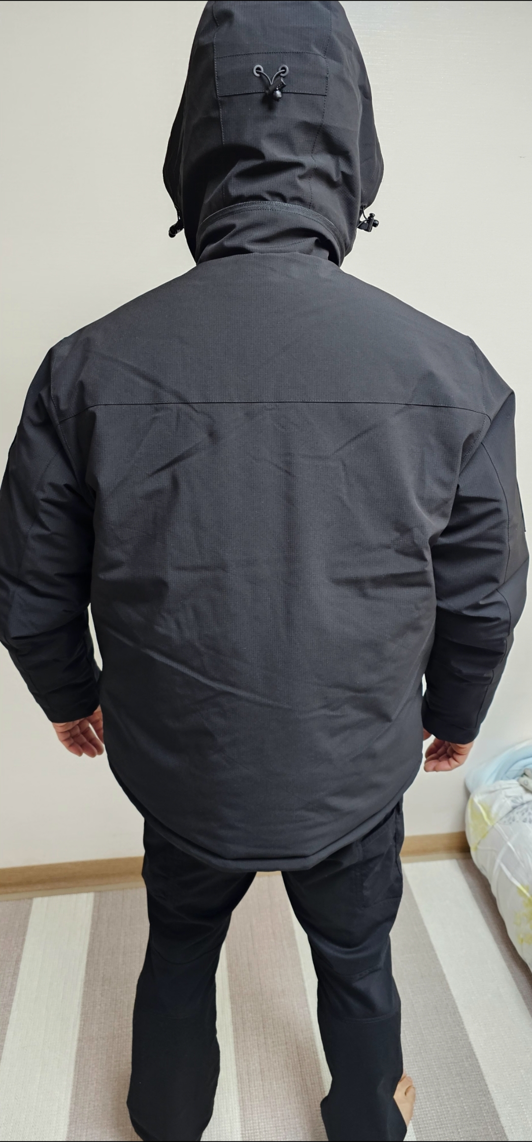 우선 사이즈는 추울때 얇은 패딩을 하나 더 입어도 될 정도로 넉넉합니다. 지퍼나 박음질 등등의 품질은 더 말하지 않아도 될 것 같습니다. 한겨울 추위에도 잘 결딜 것 같구요 보기보단 가볍게 느껴집니다.
