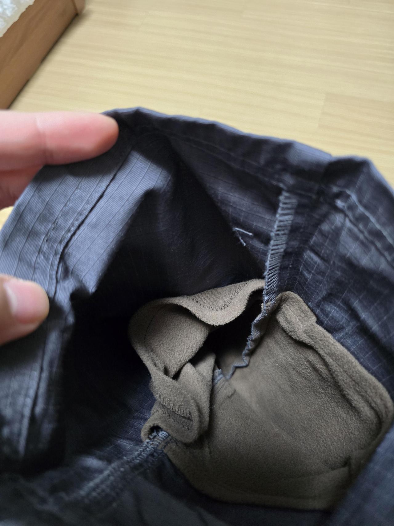 위쪽이랑 달리 아래는 기모원단이 양옆 말고는 고정되어 있지 않은데 오히려 그것때문에 바지랑 기모원단 사이에 따듯한 공기층이 생겨서 따듯하지 않을까 기대해봅니다.