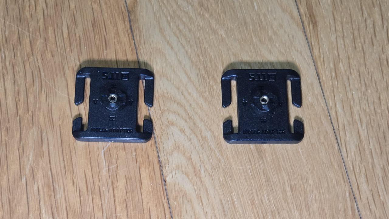 어댑터는 두종류입니다. 밸크로에 부착할수 있도록 하는 어댑터와 몰리 규격웨빙에 달수 있도록 하는 어댑터입니다. 보면 육각렌치로 풀수 있습니다만 육각렌치는 본 제품에 포함되어 있지 않습니다.