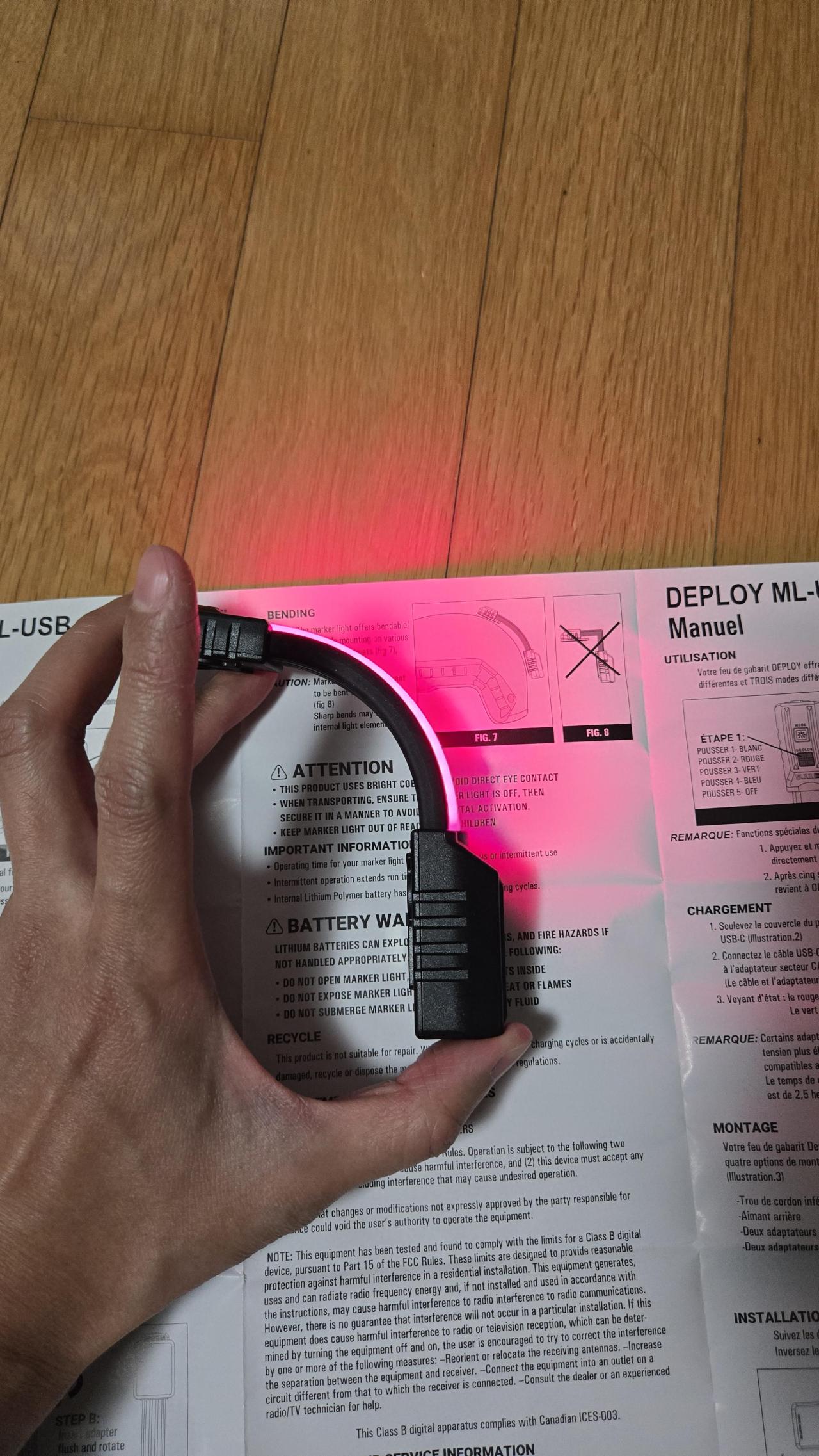 이 제품의 특징, 휘어집니다. 그 상태로 점등이 됩니다. 하지만 접지는 맙시다. 사진에 같이 찍혀있는 사용설명서에도 저렇게 꺽지 말라고 적혀있습니다.