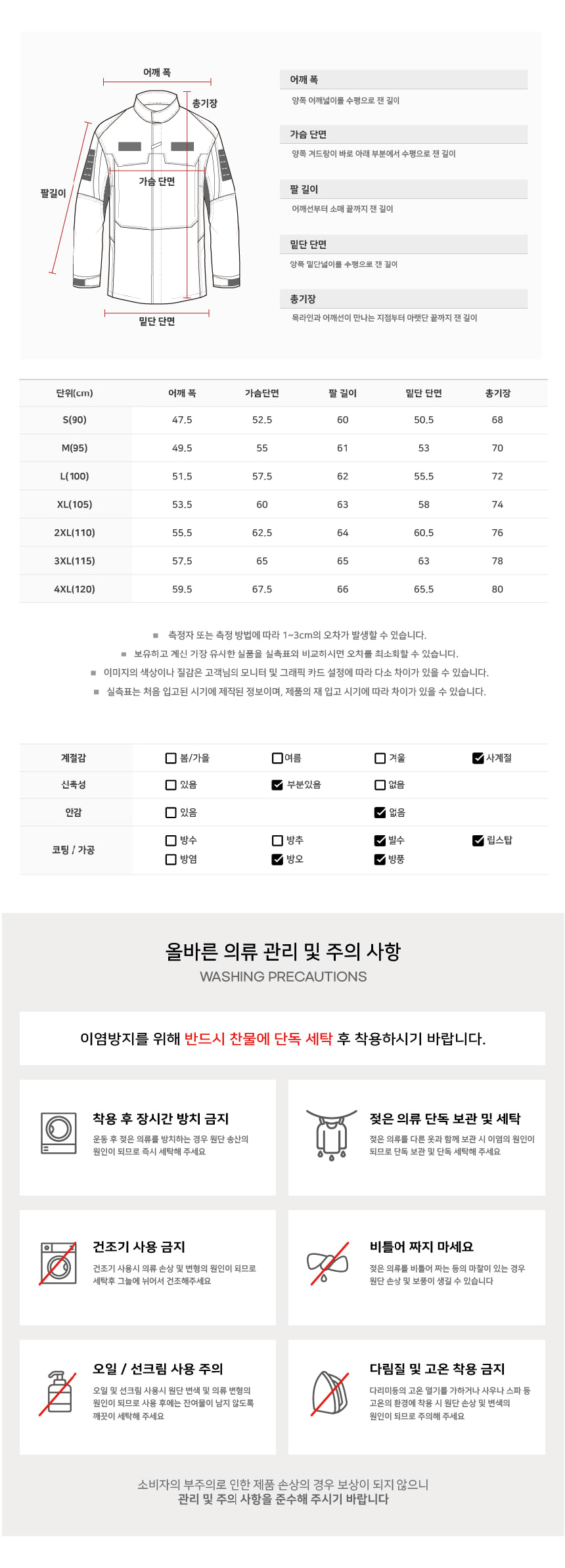 표백제 및 강력 세제 등 사용 금지 / 건조기 사용 금지 |