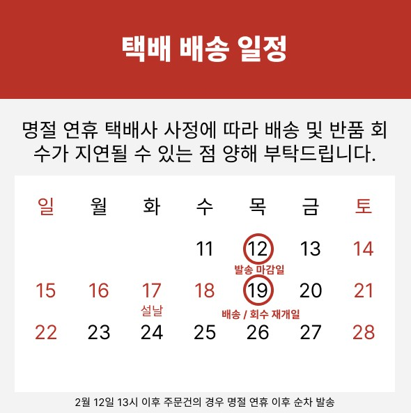 · 협력사 및 택배사 사정으로 배송지연이 발생할 수 있습니다. · 기획전 등 주문 수집 상황에 따라 배송마감시간이 변경될 수 있습니다. · 도서/산간 및 일부 지역은 배송까지 1~3일이 더 소요될 수 있습니다. · 주문제작 상품의 경우 배송기간이 다를 수 있으며, 상품상세정보를 확인하시기 바랍니다. · 네이버페이 경우 주문수집 시간차로 당일 배송이 어려울 수 있습니다. |